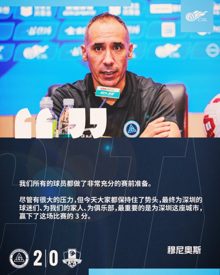 赛后新闻发布会上,主教练佩普·穆尼奥斯表示:“我们所有的球员都做了非常充分的赛前准备。尽管有很大的压力,但今天大家都保持住了势头,最终为深圳的球迷们、为我们的家人、为俱乐部,最重要的是为深圳这座城市,赢下了这场比赛的3分。”