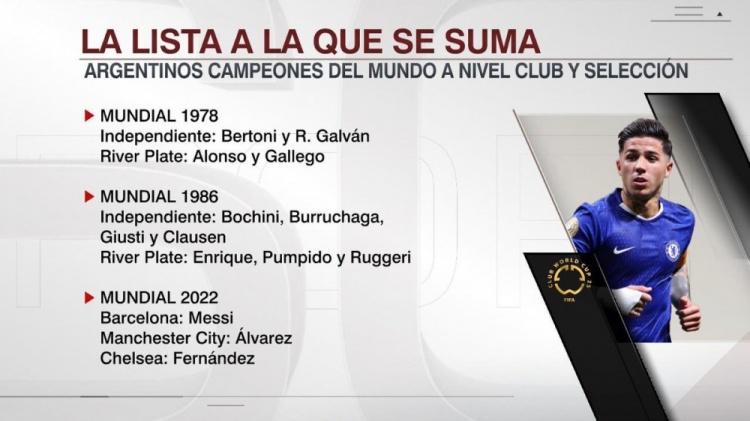 据ESPN统计,恩佐是第14位获得过世界杯+世俱杯冠军的阿根廷球员。